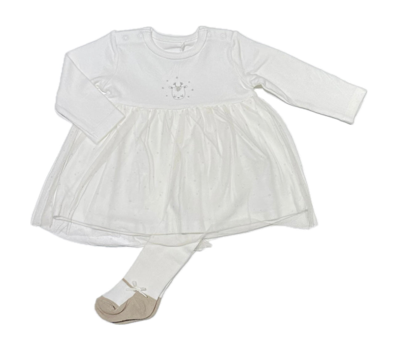 Abitino in ciniglia e in tulle , unica variante di colore Bianco in fantasia renna. Completo di calze, vestibilità regolare.
