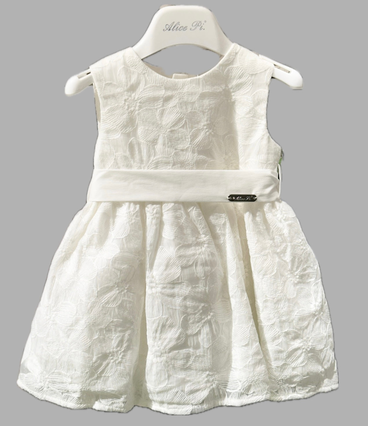 Abito Elegante e Raffinato firmato Alice Pi. Fondo Avorio con ricami in fiore, giro manica, chiusura sul retro con cerniera, fascia in vita, rivestito all’interno, vestibilità regolare.