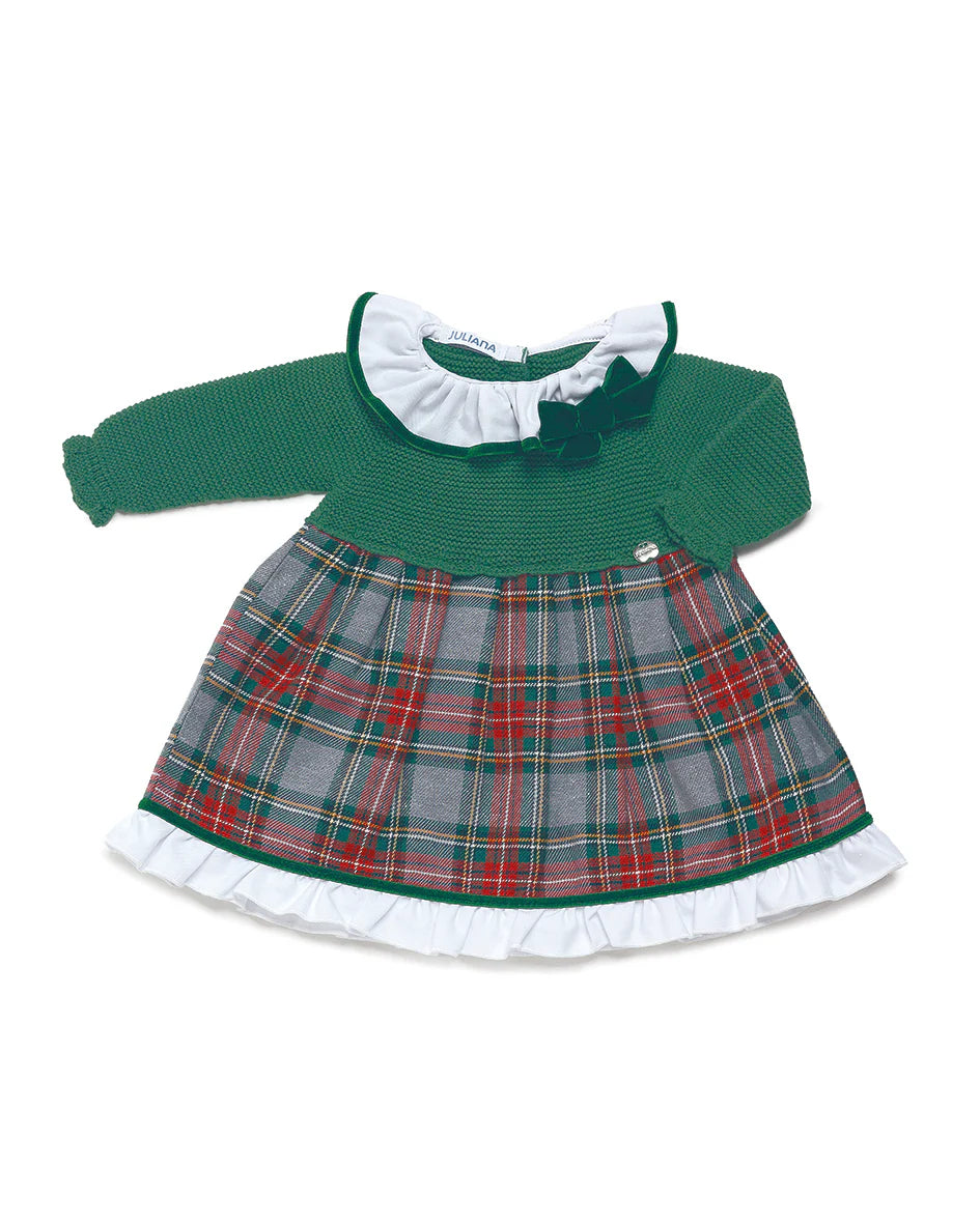 Abitino in acrilico e in cotone, unica variante di colore Verde in fantasia Tartan, colletto in rouge con fiocco in velluto , chiusura sul retro con bottoncini.