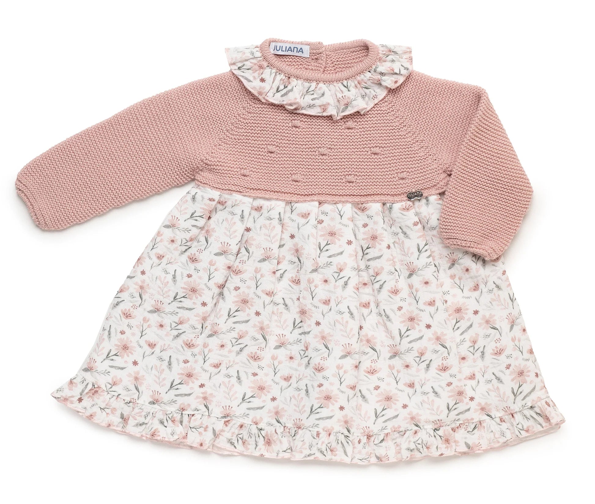 Abito Juliana bambina fondo Rosa e Bianco, manica lunga, colletto con volant fondo in fantasia fiori, chiusura sul retro con bottoni, vestibilità regolare.