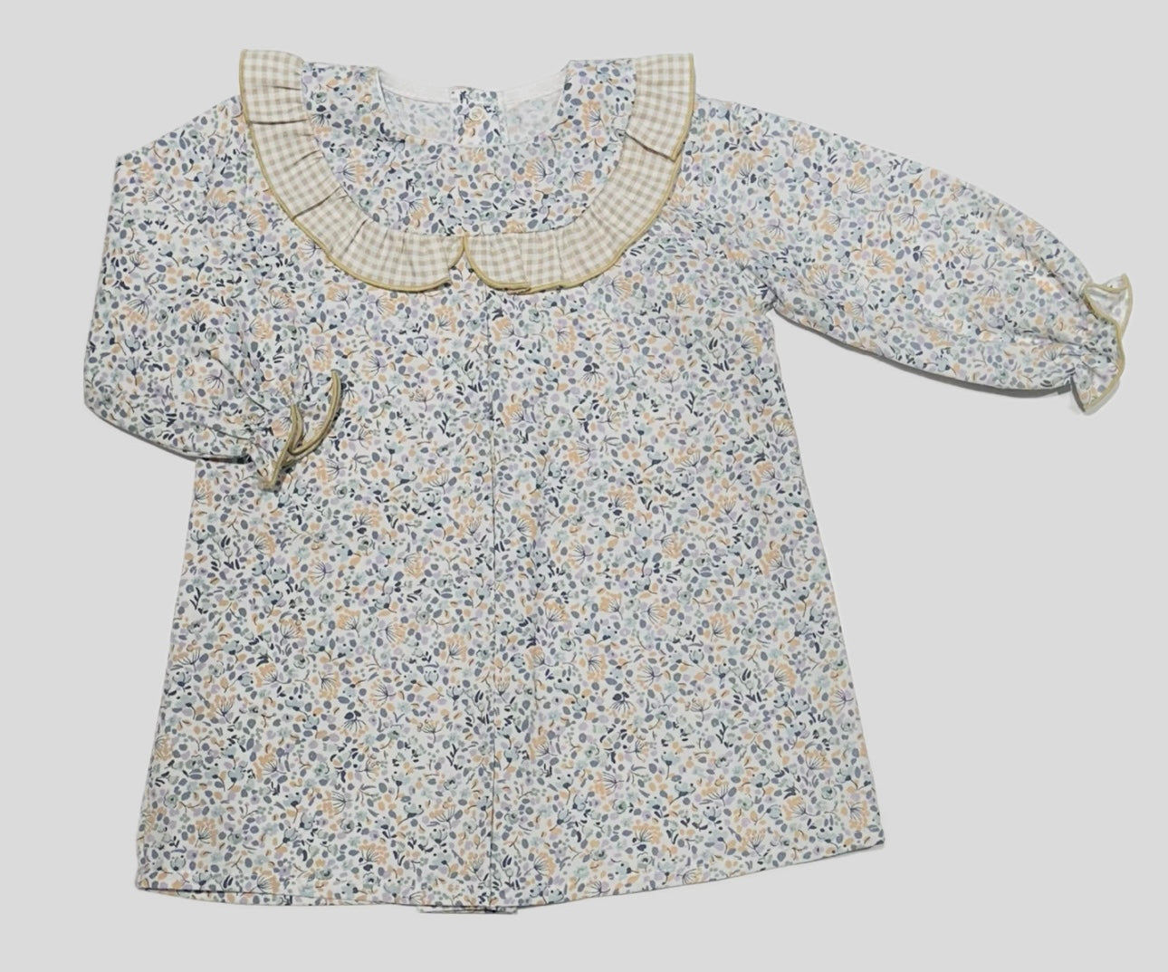 Abito Neonata Rapife in cotone, fantasia Fiori fondo Bianco. Composto dal colletto con profili a fantasia in contrasto di colore, chiusura sul retro con bottoni a pressione, vestibilità regolare.