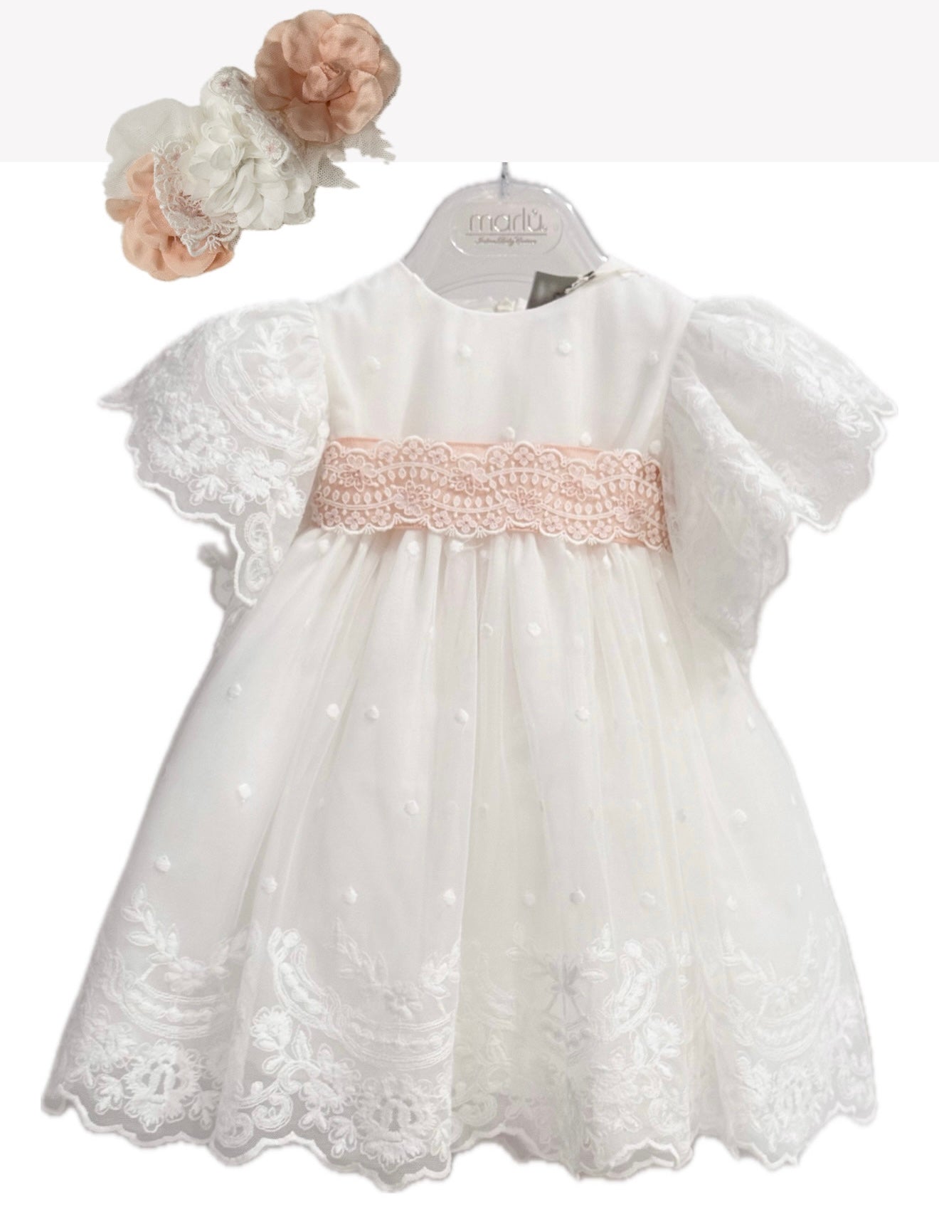 Abito Cerimonia Battesimo Marlù neonata, fondo Bianco con rimani in pizzo, fascia in vita Rosa, manica con volant, chiusura sul retro con cerniera, completo di fascia abbinata con fiori in rilievo, Abbinabili le scarpine rif. ER301SC.