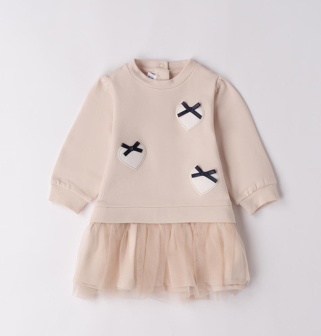 Abito per bimba Minibanda realizzato in felpa invernale di cotone stretch, felpata internamente, con gonna in tulle. Modello arricchito da fiocchi e applicazioni ricamo. Lunghezza sopra al ginocchio. Apertura dietro con bottoni snap. Acquistando prodotti in cotone, stai sostenendo l'impegno di Minibanda nella missione Better Cotton.
