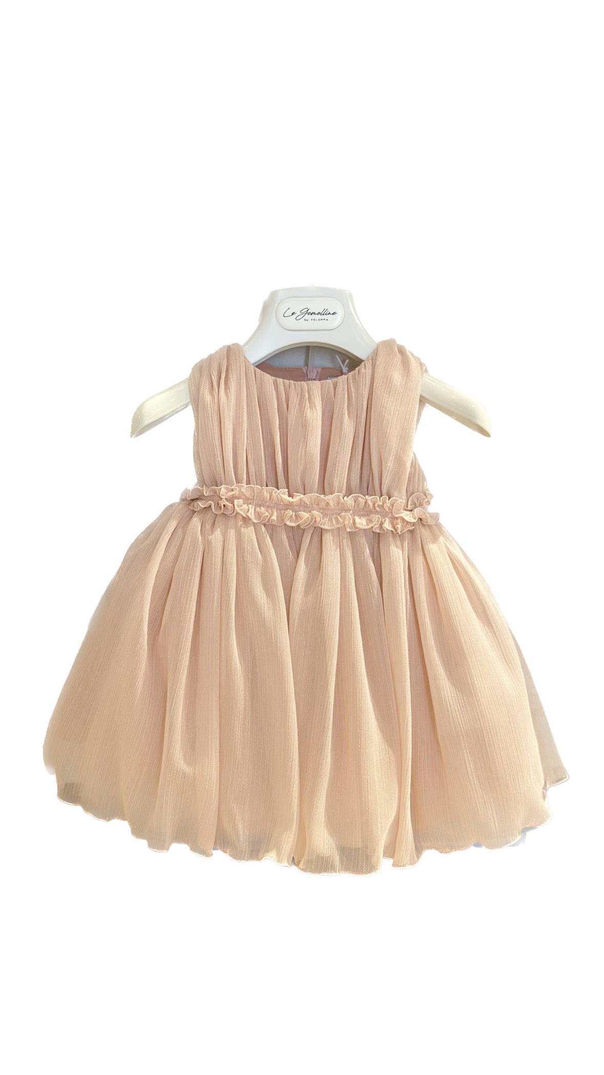 Abito unica variante di colore Rosa Antico. Giromanica e scollo tondo, cinturino in vita con rouches, fondo ampio foderato all’interno, ideale per cerimonie e battesimi, con culotte abbinata vestibilitá regolare.