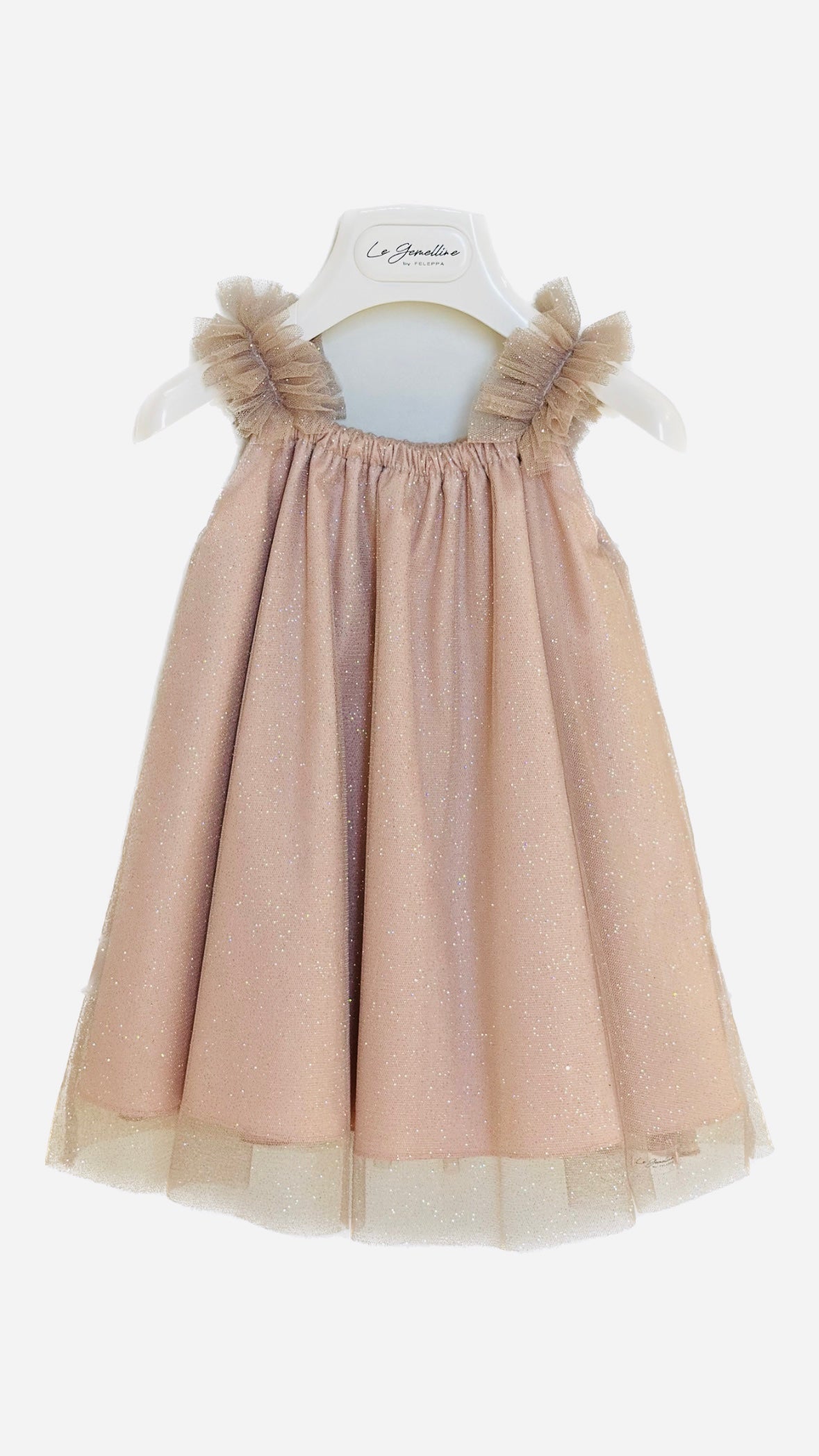 Abito 100% poliestere, disponibile in due varianti di colore Bianco, Rosa Antico. Bretelle con rouches, fondo ampio ideale per cerimonie e battesimi, con culotte abbinata vestibilitá regolare.
