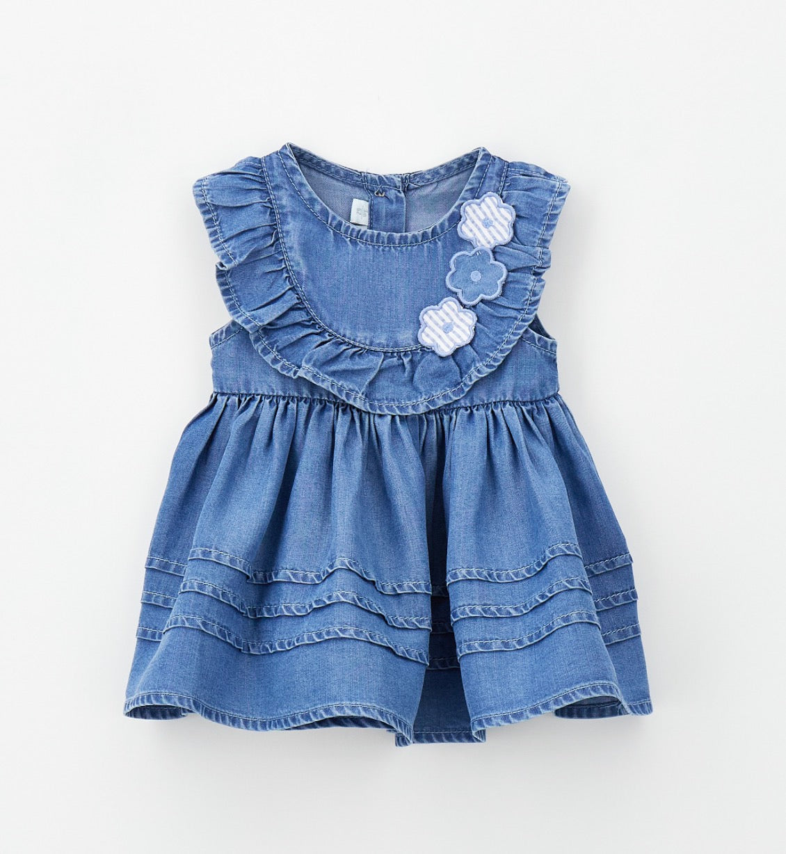 Abito Minibanda neonata in denim, realizzato con fiorellini laterali, chiusura con bottoni sul retro, vestibilità regolare.