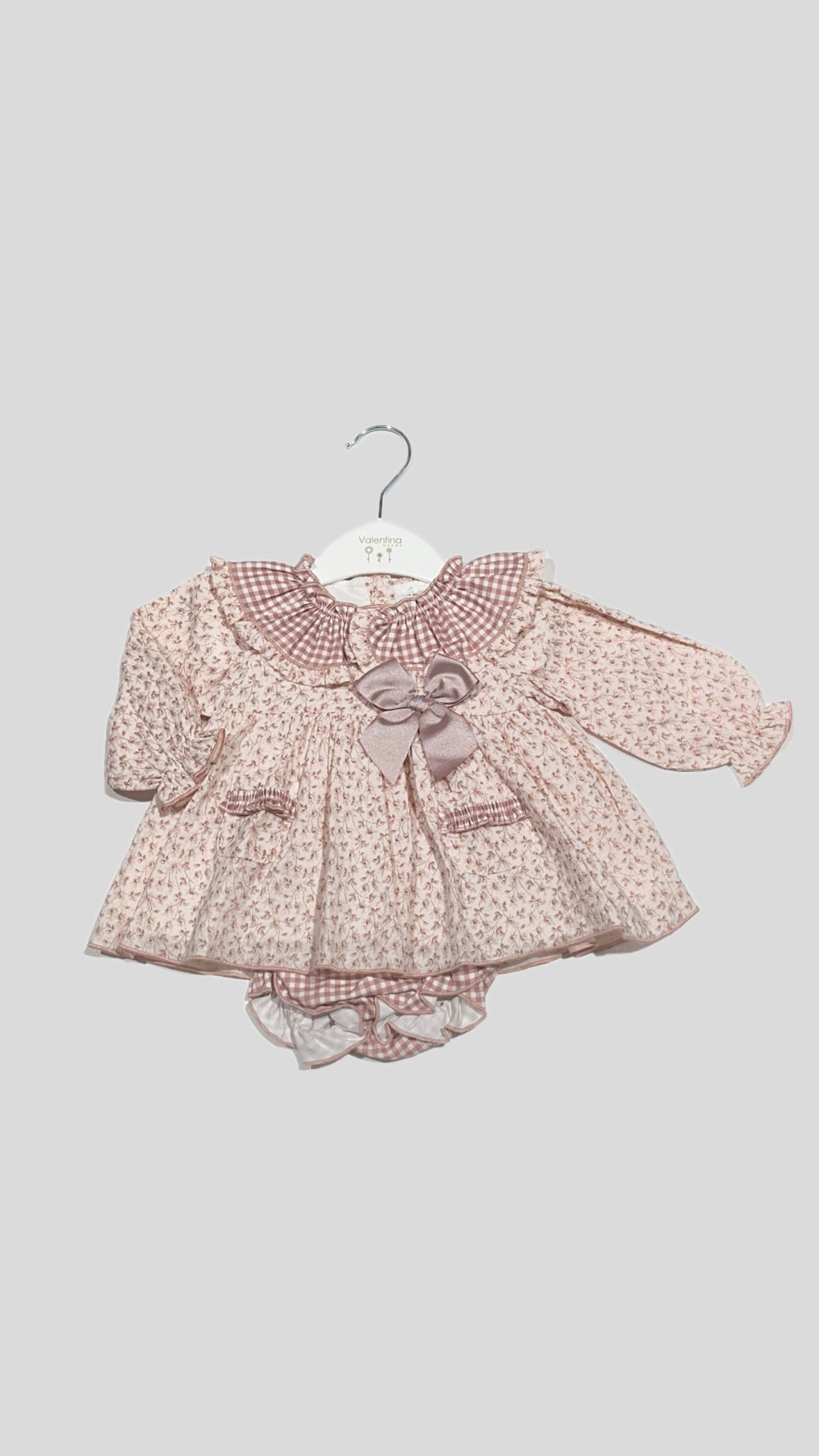 Abito Valentina Bebés neonata/bimba. Fondo Rosa, fantasia a fiorellini, fiocco laterale, colletto. Chiusura sul retro con bottoni, completo di culottina, doppio taschino sul davanti, vestibilità regolare.