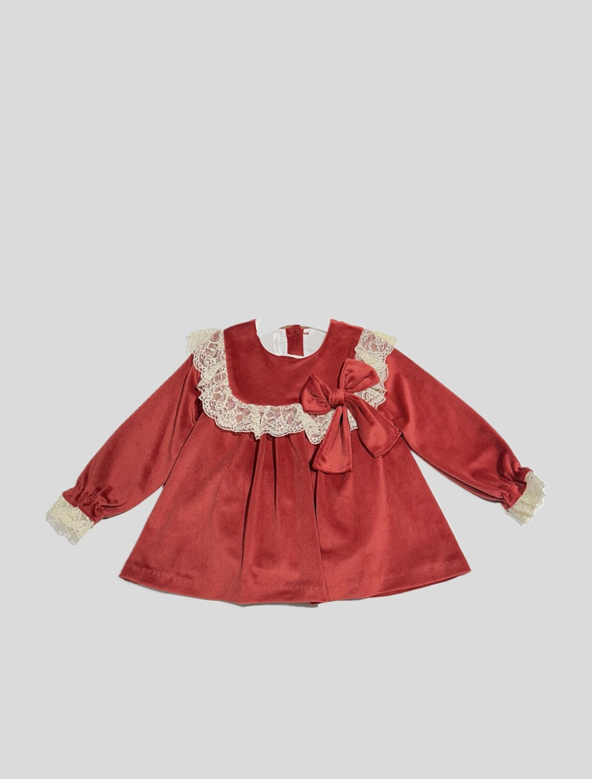 Abito Valentina Bebés modello ideale per le feste Natalizie, fondo Rosso in vellutino. Ricami e profili in pizzo, fiocco laterale in rilievo, chiusura con bottoni sul retro, completo di culotte, vestibilità regolare.