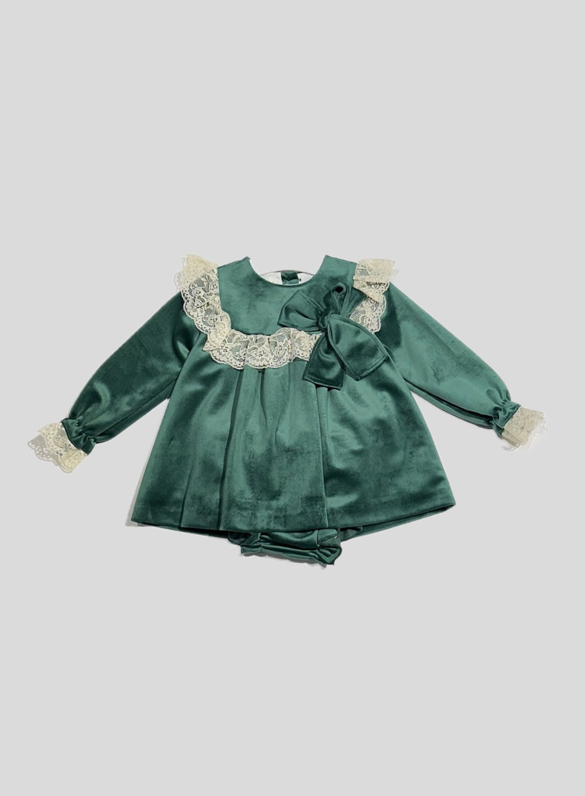 Abito Valentina Bebés neonata/bambina, fondo Verde in velluto. Profili in pizzo con fiocco laterale in rilievo, chiusura con bottoni sul retro, completo di culotte, vestibilità regolare.