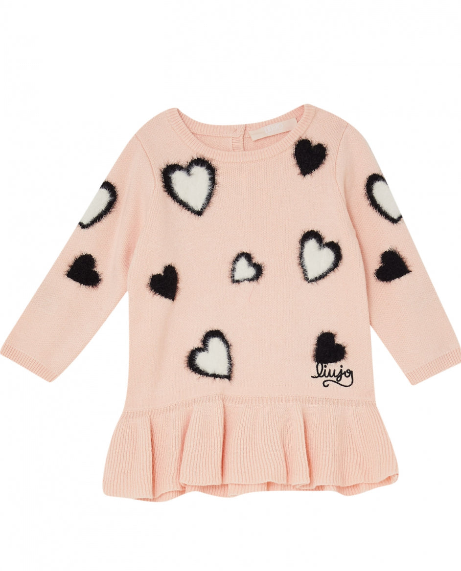 Abito in maglia neonata Liu Jo, fondo Rosa manica lunga, cuoricini in contrasto di colore, balza sul fondo, vestibilità regolare.