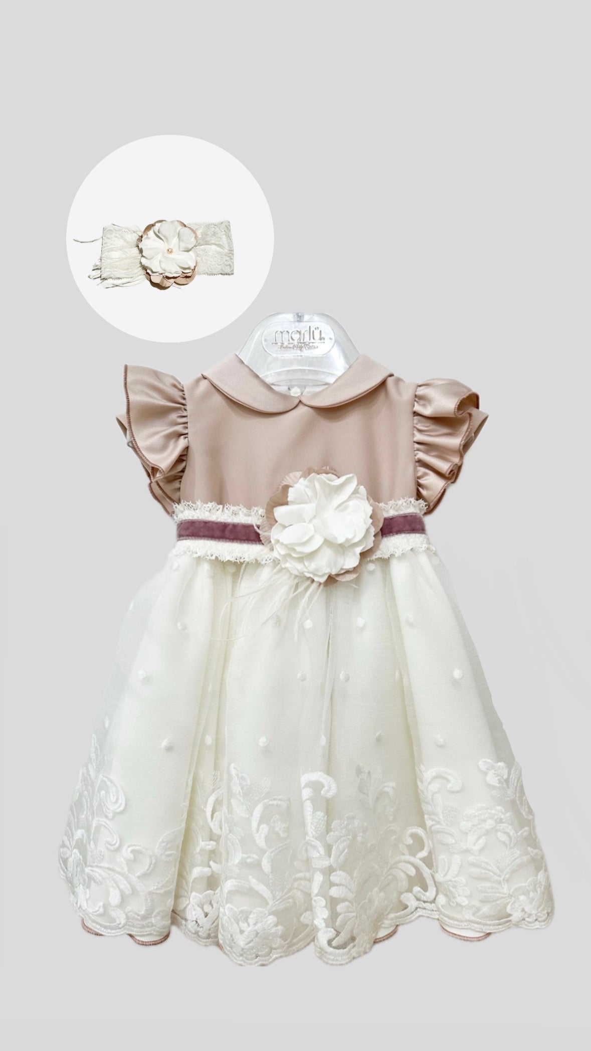 Meraviglioso Abito Neonata battesimale o da cerimonia Marlù, fondo Bianco, con ricami in pizzo sul fondo, mezza lunga con volant volant e fiore in rilievo sul davanti, colletto classico, chiusura con cerniera sul retro. Abbinata la fascia con fiore e pizzo. Abbinabile scarpine rif IK319SC.