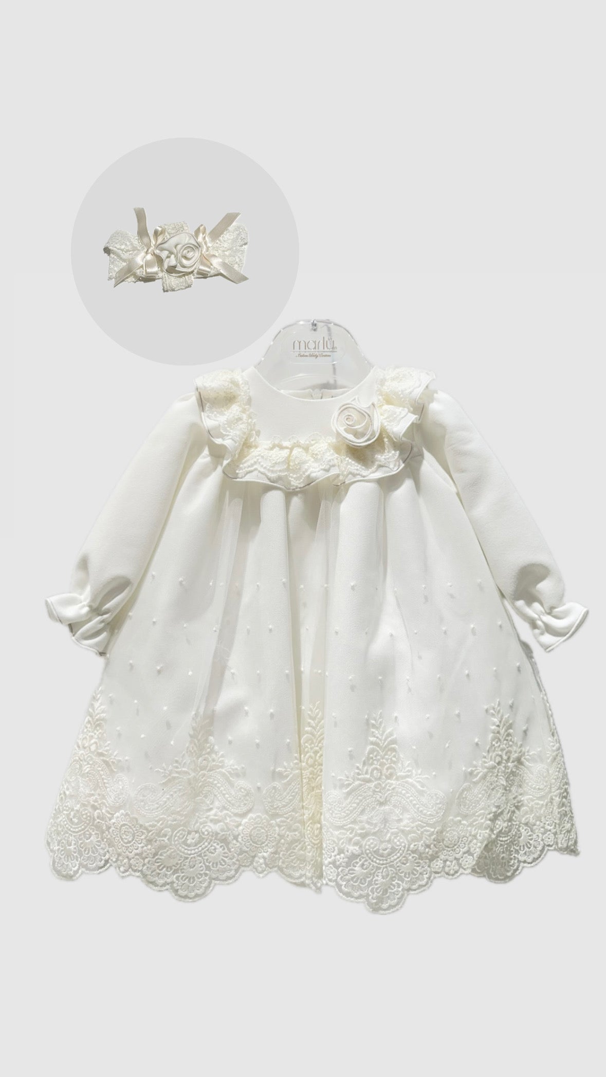Meraviglioso Abito Neonata battesimale o da cerimonia Marlù, fondo Bianco, con ricami in pizzo sul fondo, manica lunga, volant e fiore in rilievo sul davanti, chiusura con cerniera sul retro. Abbinata la fascia con fiore e pizzo. Abbinabile scarpine rif IK323SC.