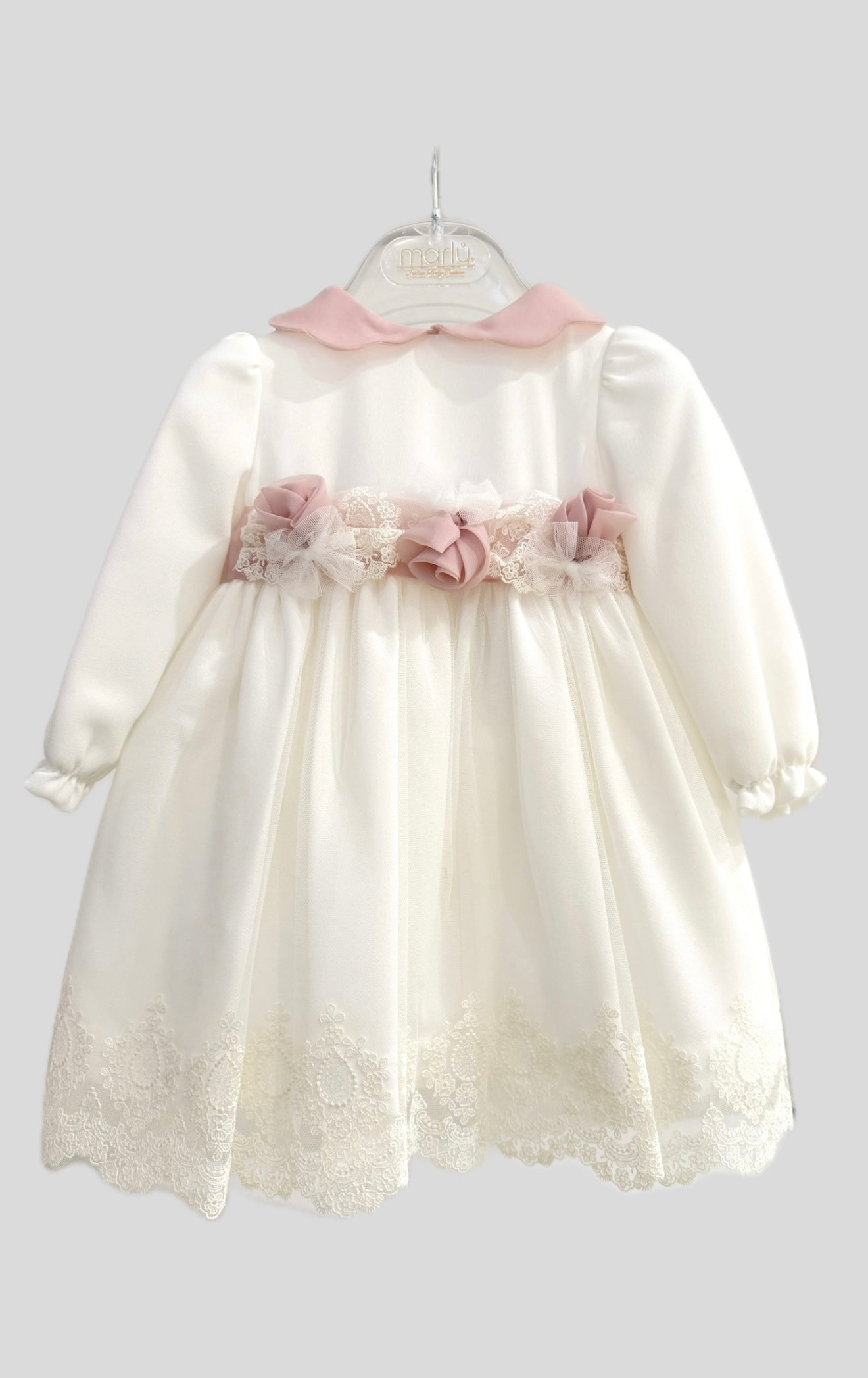 Abito Marlù Neonata, raffinato ed elegante, ideale per battesimo e cerimonie. Fondo Bianco con ricami e profili in contrasto di colore con Rosa. Manica lunga con ricami in pizzo sul fondo, foderato all’interno, fascia in vita con rose in rilievo, colletto classico, chiusura sul retro cerniera.