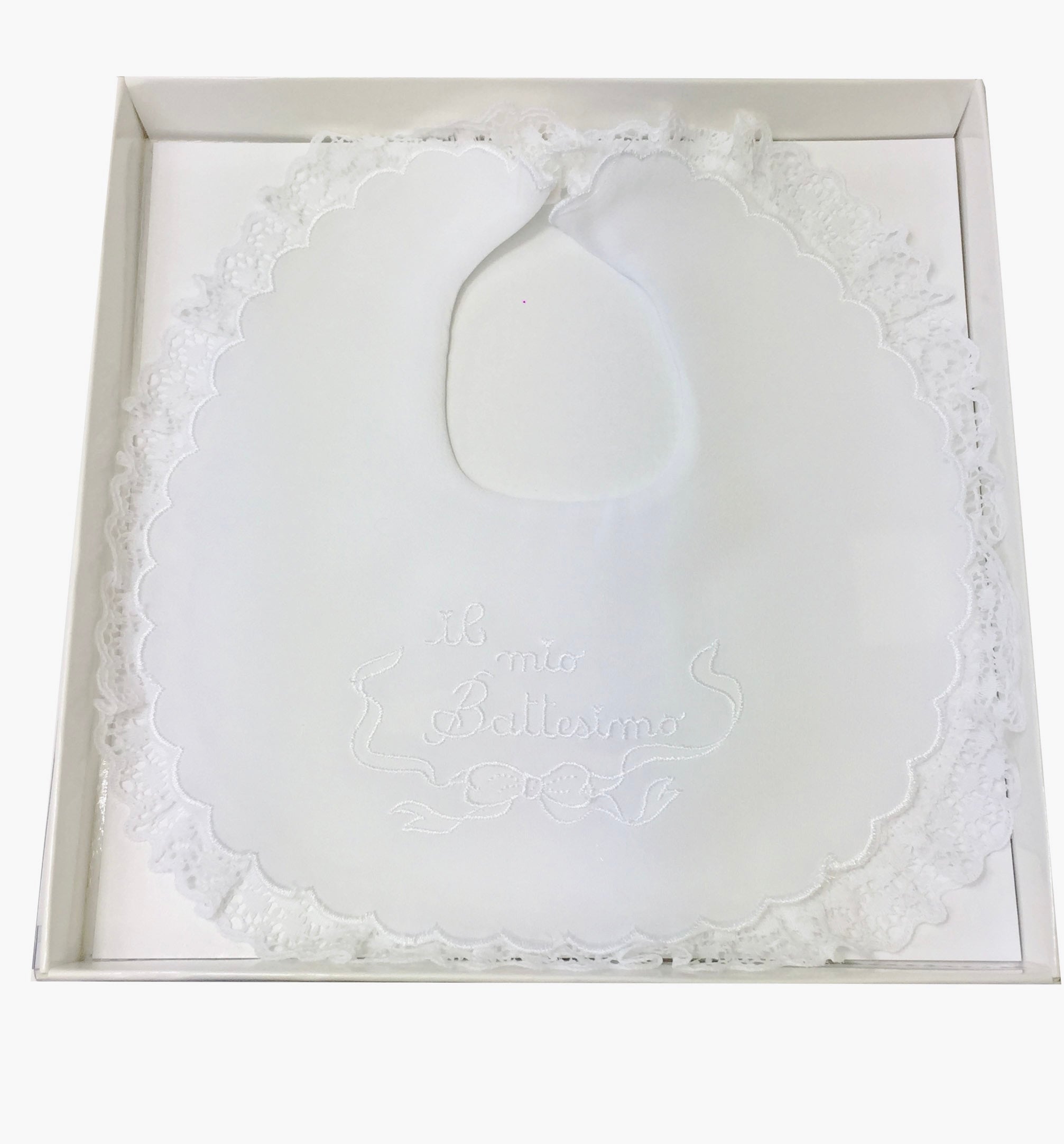 Bavetta battesimale bambina, disponibile in due varianti di colore Bianco e Panna con ricami in pizzo San Gallo, regolabile con laccetti.
