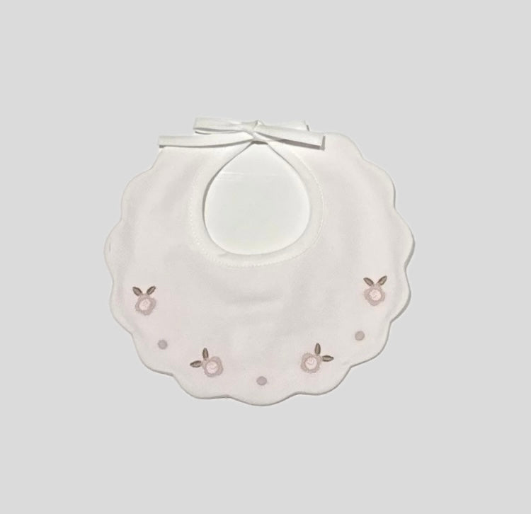 Bavetta Marlù neonata, fondo Rosa. Realizzata con fiori ricamati.