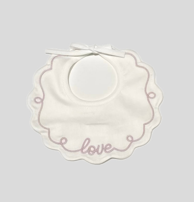 Bavetta raffinata ed elegante Marlù neonata, fondo Bianco con ricami in contrasto di colore, è scritta love sul davanti.