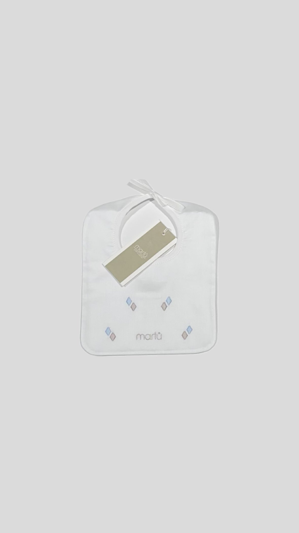 Bavetta Marlù neonato, fondo Bianco con ricami e profili Noce e Cielo, chiusura sul retro.