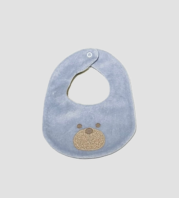 Bavetta Marlù in ciniglia, fondo Cielo. Realizzata con chiusura sul retro con bottone a pressione, orsetto sul davanti in rilievo e in tessuto Teddy, possibile abbinare con Set Tutina IN7014 e Completo IN7051.
