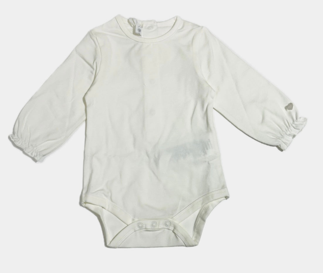 Body Neonata in caldo cotone fondo panna, manica lunga, girocollo, chiusura sul fondo.
