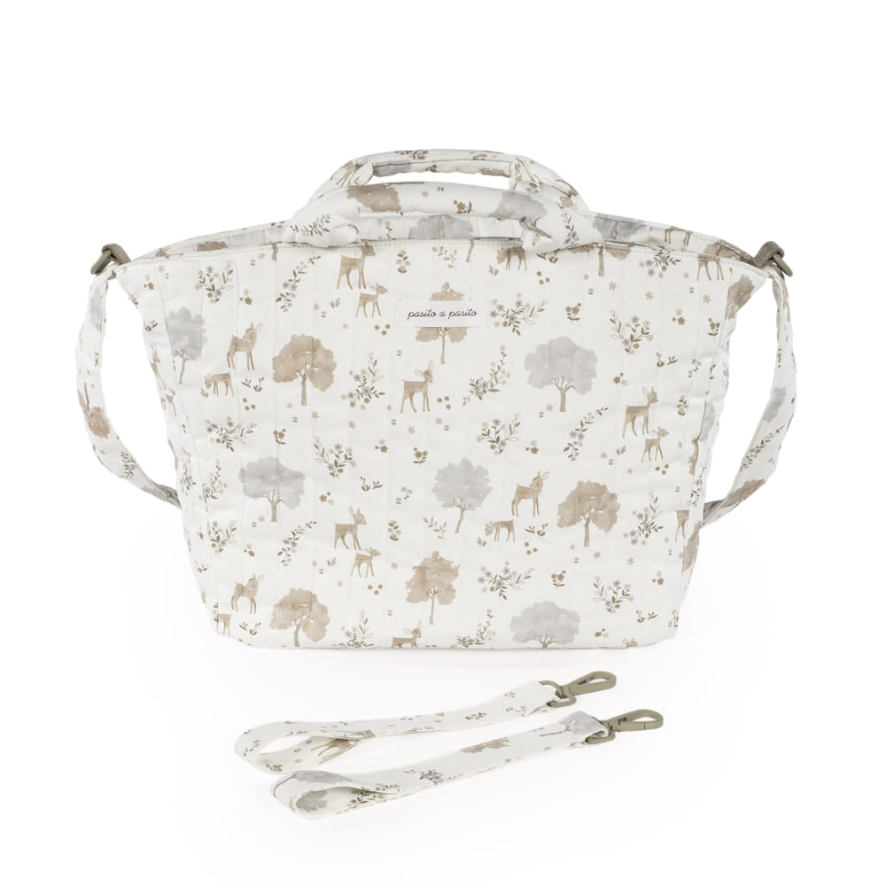La borsa fasciatoio Nara di Pasito a Pasito è un modello unico, realizzato in 100% cotone canvas con una delicata stampa di cervi e alberi in tonalità neutre. Il trattamento impermeabile la rende resistente all’acqua, garantendo protezione e durata nell’uso quotidiano. È un design elegante e pratico, con un’ampia capacità che permette di portare con sé tutto il necessario. Dispone di un doppio manico, uno lungo per portarla a spalla e due più corti per il trasporto a mano, oltre a cinghie universali aggiuntive per agganciarla al passeggino.
