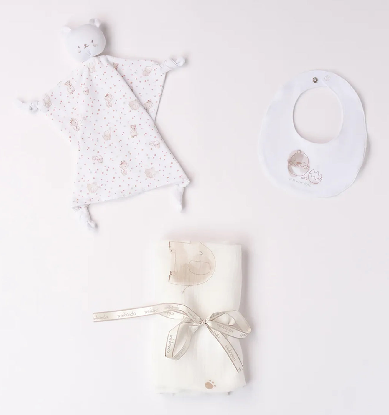 Carinissima box infanzia Minibanda, all’interno contiene un DòDò a fantasia, bavetta, e pannetto di garza.