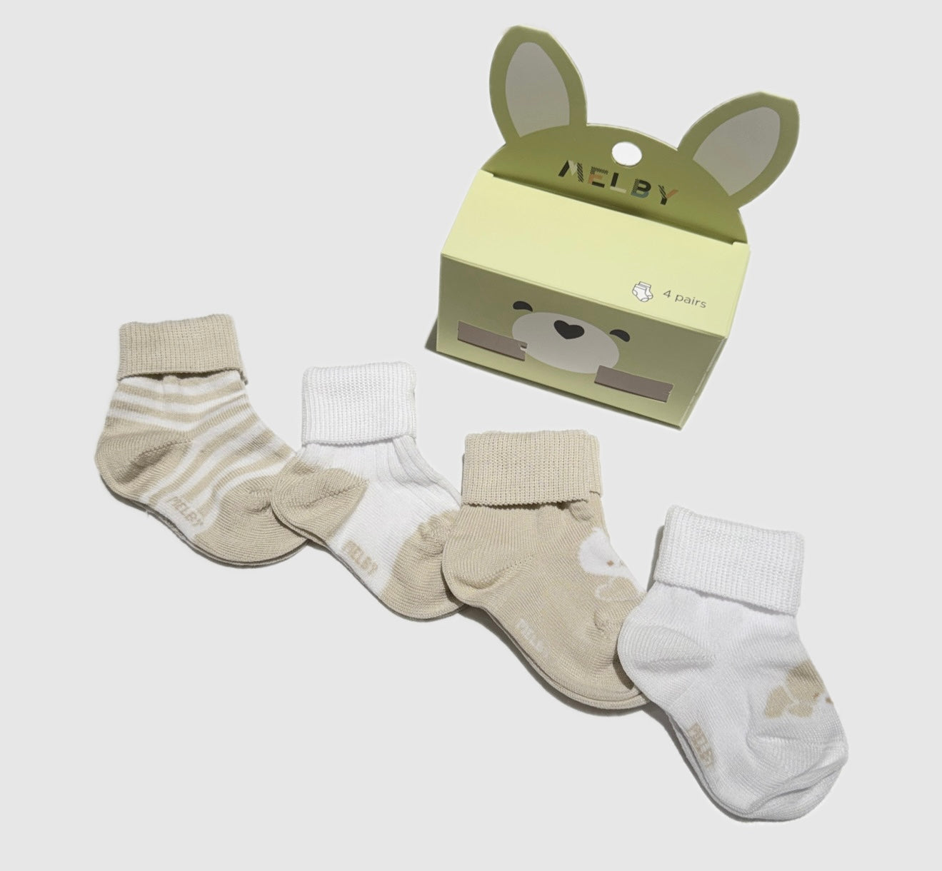 Scatolina Melby composta da 4 paia di calzini neutri a fantasia.