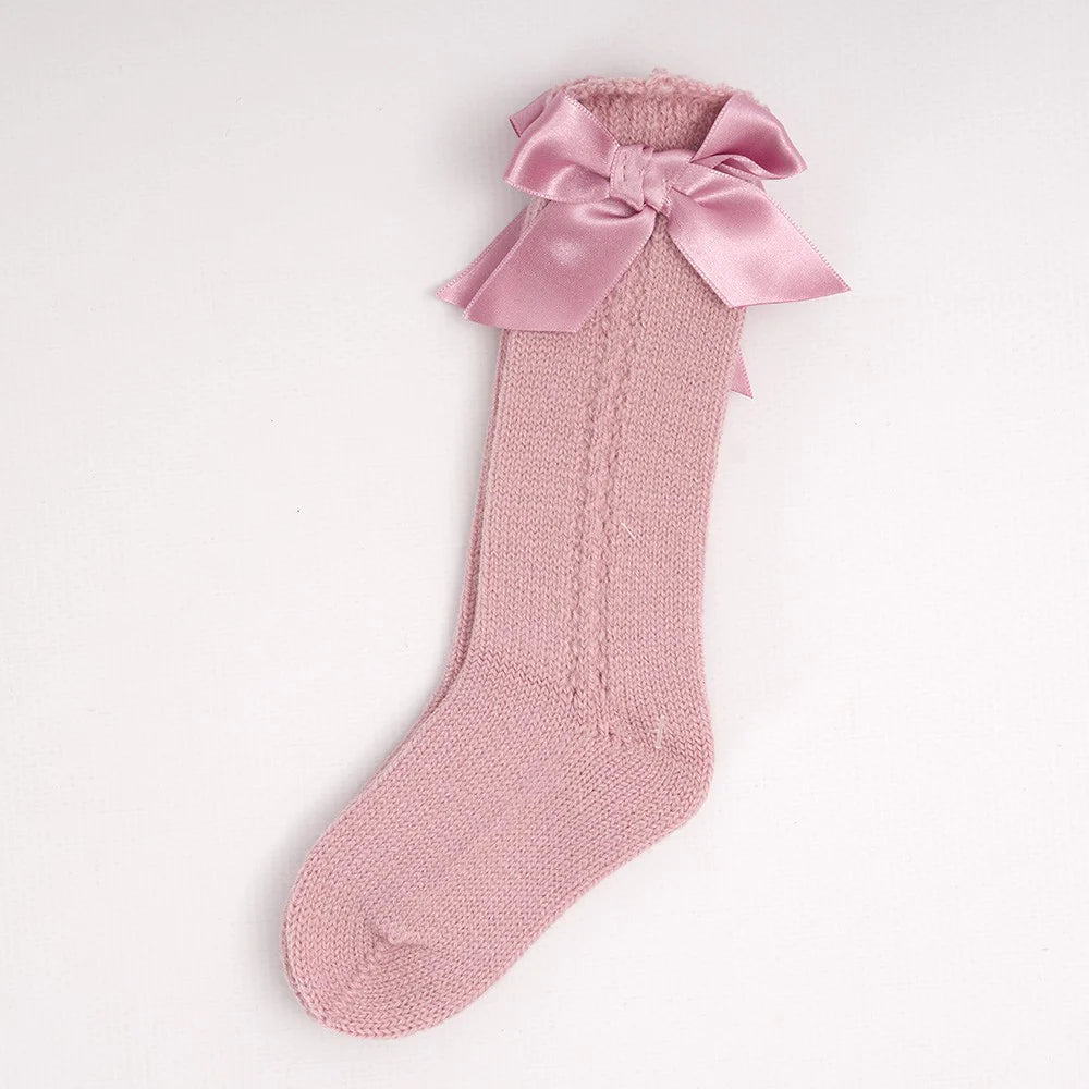 Calzini misto lana, realizzati con fiocco in Raso, disponibile in tredici varianti di colore, Senape, Verde Scuro, Verde Acqua, Maquillaje, Rosa Nude, Mattone, Bordeaux, Rosso, Grigio Chiaro, Grigio Scuro, Grigio, Blu, Rosa Chiaro.
