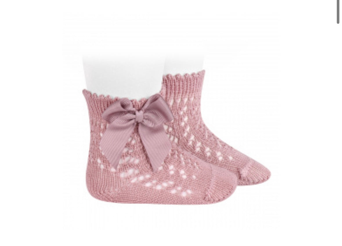 Calzino corto in cotone traforato con fiocco, disponibile in tre varianti di colore Rosa 500, Bianco 200, Rosa Pallido 526.