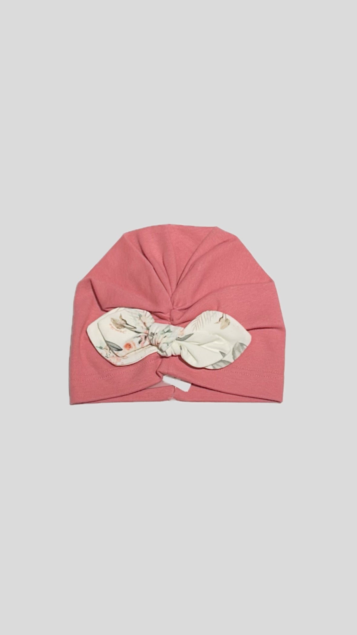 Cappello Jamiks modello turbante disponibile in tre varianti di colore Pesca, Rosa, Giallo, fiocco lo sul davanti a fantasia in rilievo.