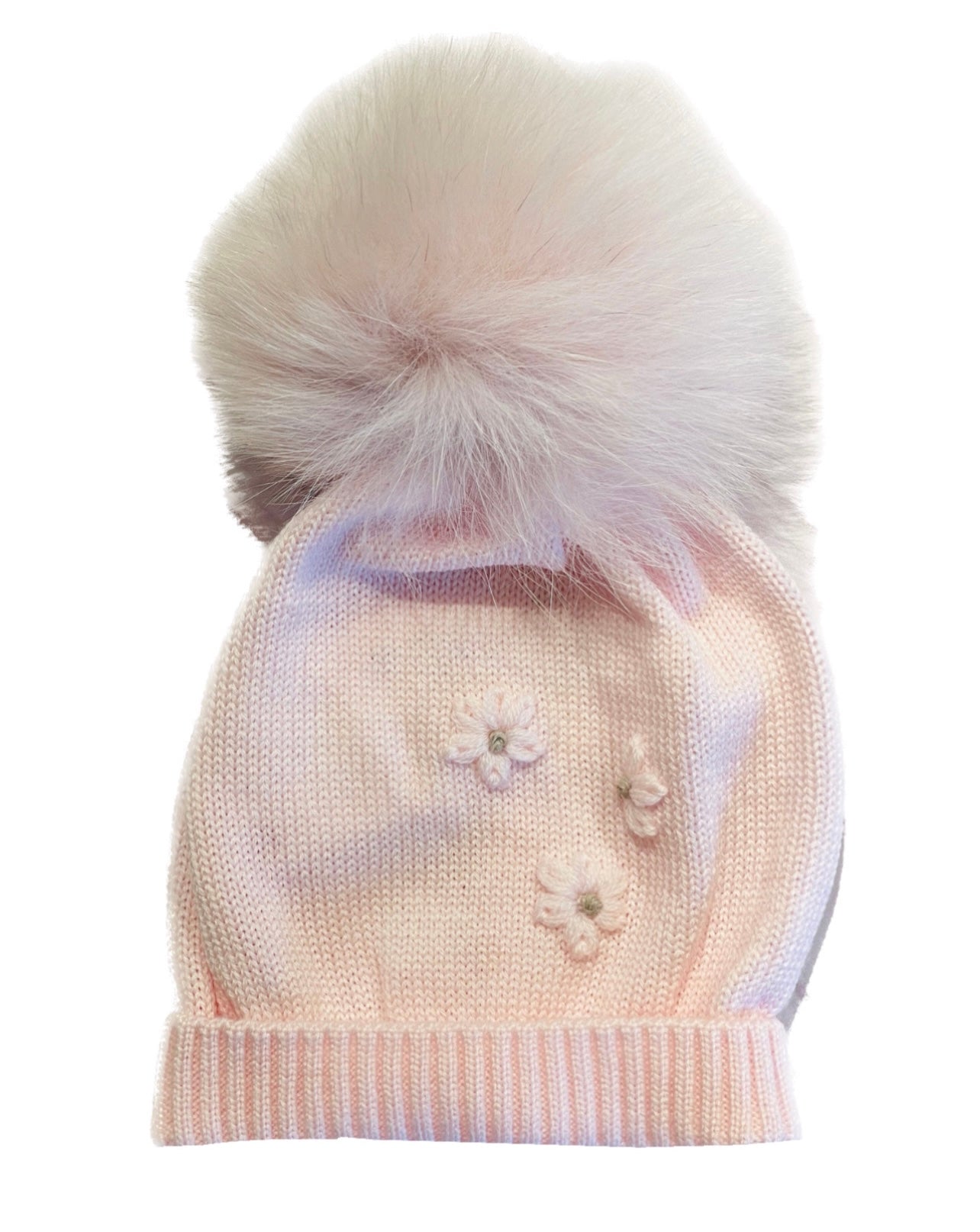 Cappello 100% lana. Realizzato con pon pon pelliccia vera e ricamato con fiori in rilievo. Taglia unica.