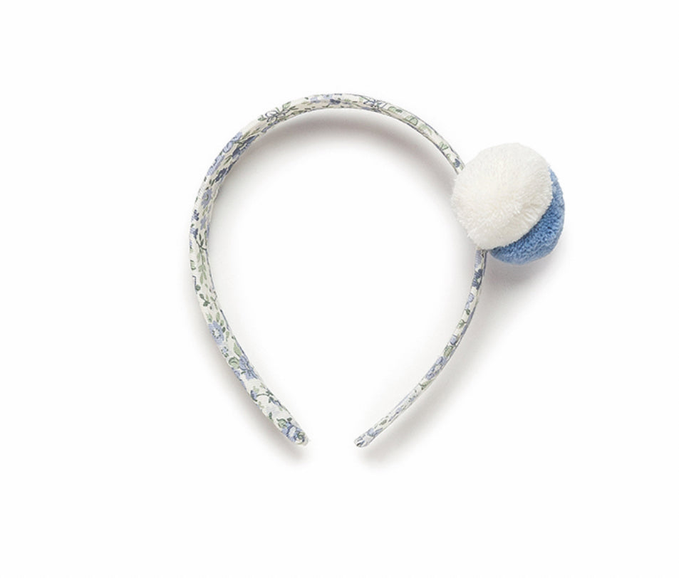 Cerchietto in fantasia floreale arricchito con doppio pon pon.