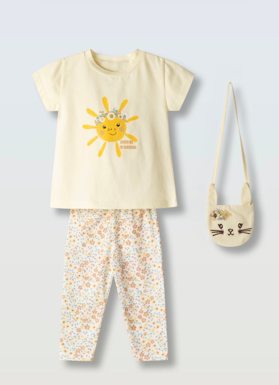 Coordinato da 3 pezzi per Neonata che combina praticità e stile estivo. Include una t-Shirt in fantasia, leggings e borsetta abbinata, perfetto per le giornate calde. Realizzato con tessuti morbidi e traspiranti, ideale per giocare e esplorare con comfort. Un set versatile che cresce con la bambina, facile da coordinare con altri pezzi del guardaroba.