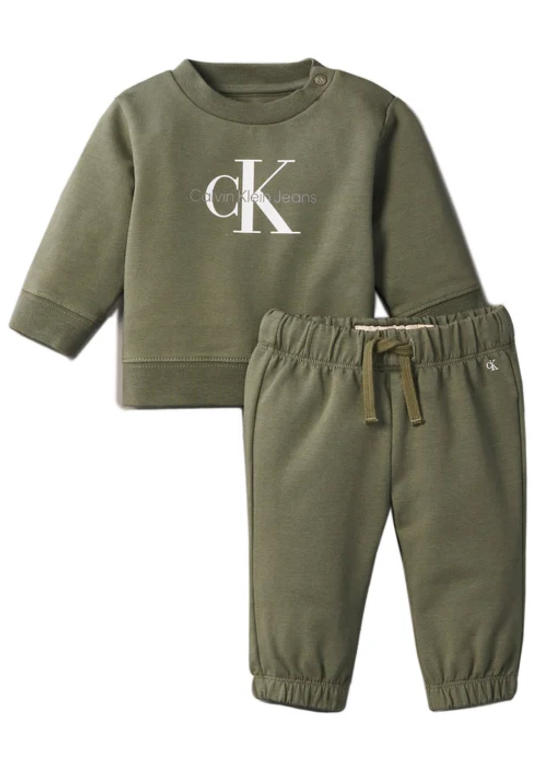 Completo Calvin Klein Jeans neonato/ bimbo fondo Verde composto dalla felpa in cotone garzato con logo Monogramm in contrasto di colore, pantalone di tuta, vestibilità regolare.