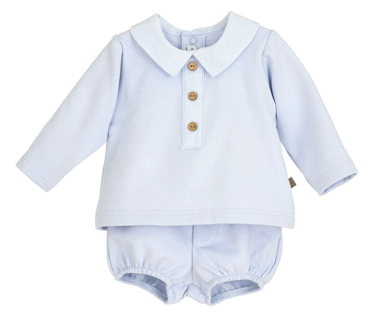 Completo Calamaro neonato, fondo Azzurro. Composto dalla maglia con colletto classico, bottoncini in legnetto sul davanti, colluttina, vestibilità regolare.