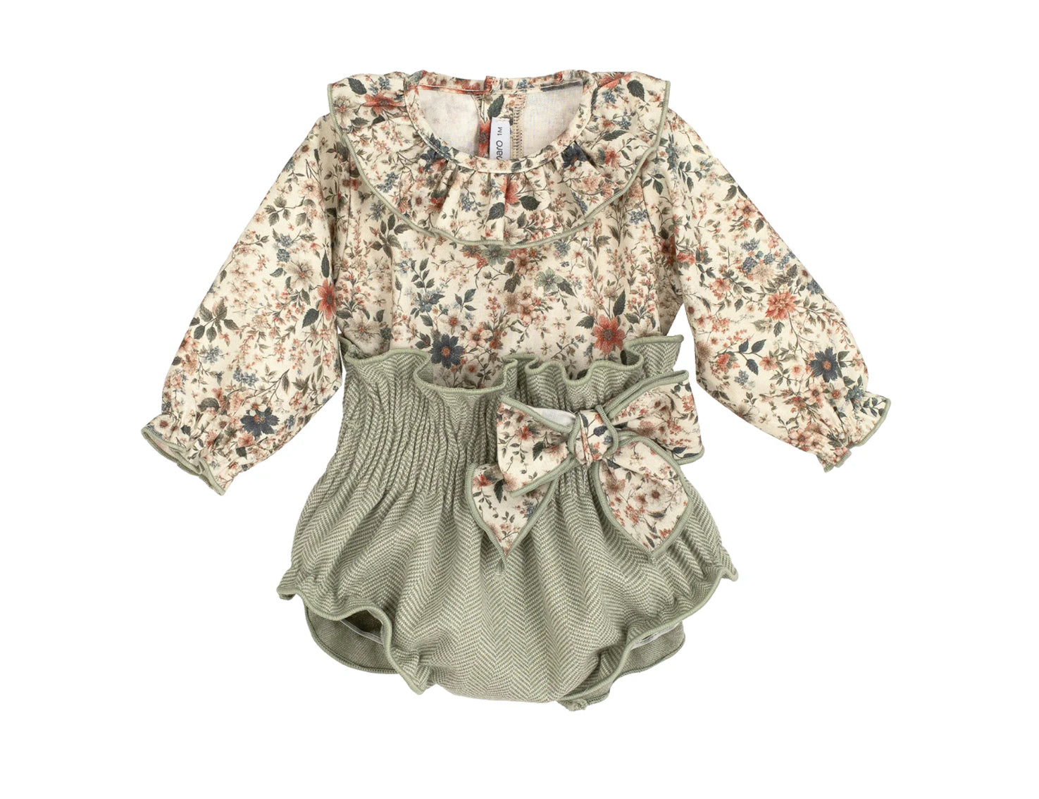 Questo completo Calamaro per neonata unisce eleganza e comfort grazie al culotte in caldo cotone, ideale per le stagioni più fresche. La camicia con stampa floreale aggiunge un tocco raffinato e alla moda, mentre il culotte arricciato con fiocco completa il look con delicatezza. Perfetto per occasioni speciali, questo outfit garantisce stile e praticità per la tua piccola.