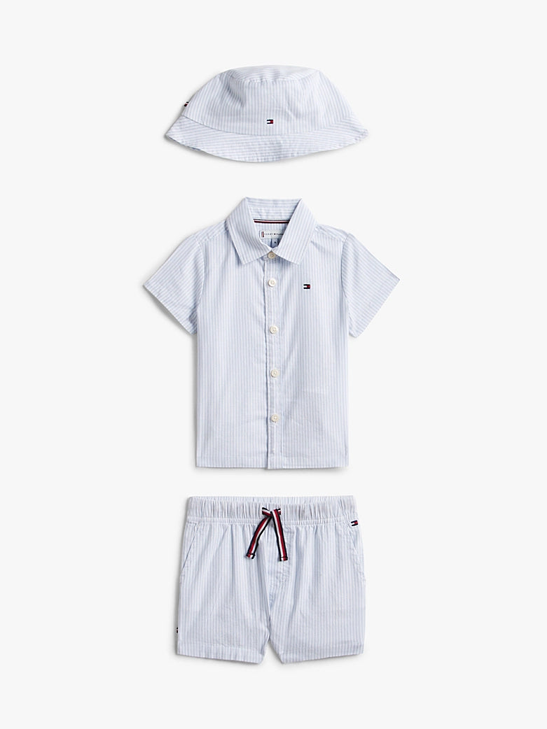 L'accattivante completo con shorts, camicia e cappellino coordinati è il regalo perfetto per il tuo bebè.