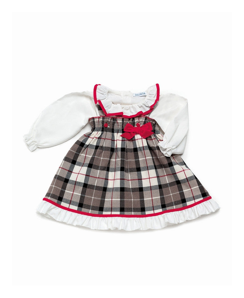Camicia a maniche lunghe e girocollo con volant in tessuto bianco e decorata con nastro di velluto rosso. Abbottonata sulla schiena. Abito con bretelle in fantasia tortan , foderato in tessuto di cotone. Gonna arricciata con elastico e volant sul fondo del capo e decorata con nastro rosso. Adorna il fiocco di velluto rosso sul petto.