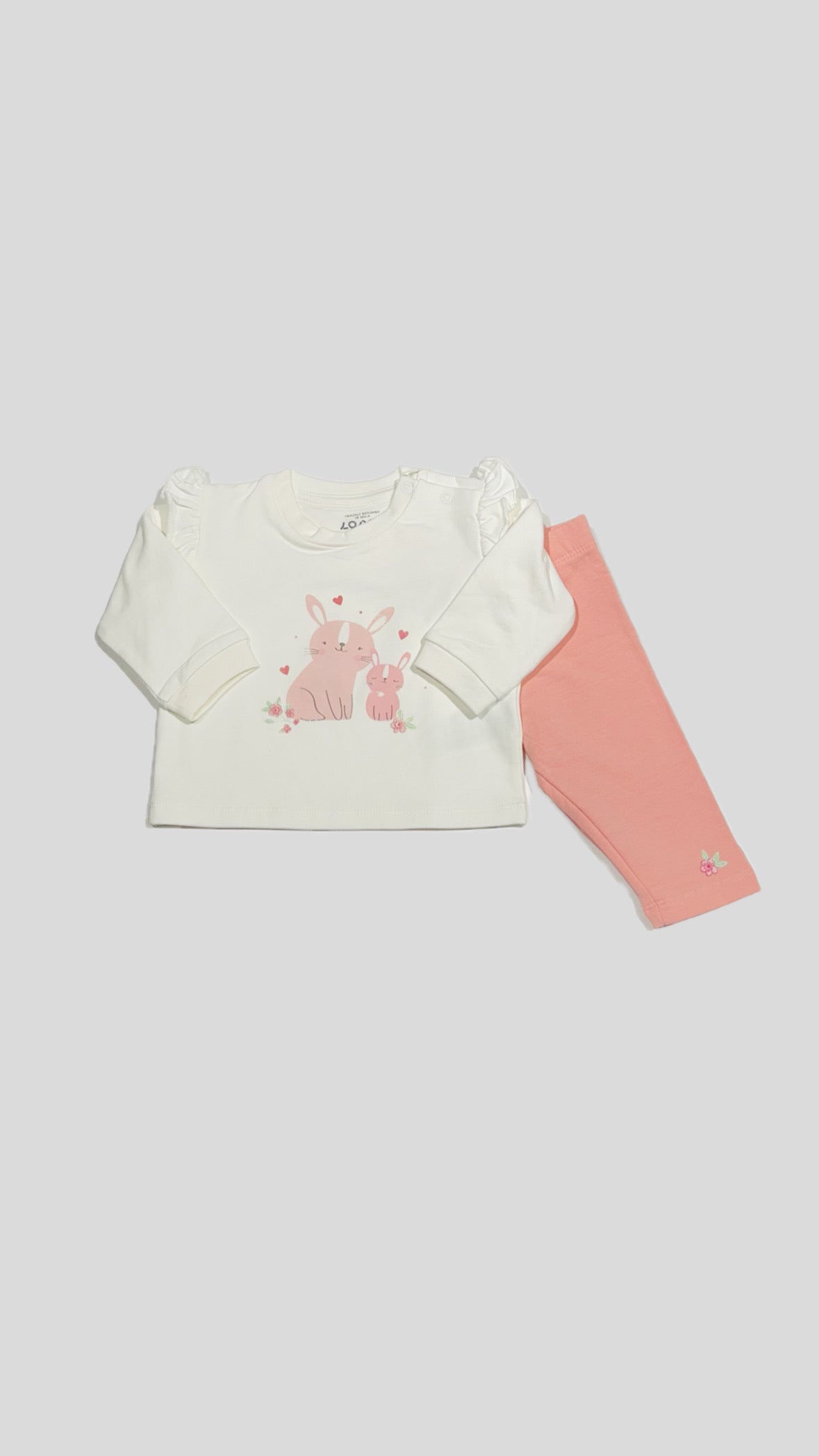 Completo Neonata composto dalla maglia a fantasia fondo Bianco e leggings Rosa.