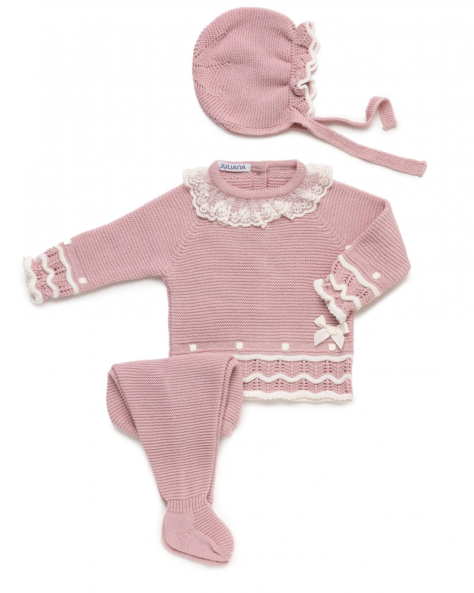 Completo Juliana neonata, fondo Rosa Maquillaje. Composto dalla maglia con profili in contrasto di colore, pantalone con piedino e cuffietta, vestibilità regolare.