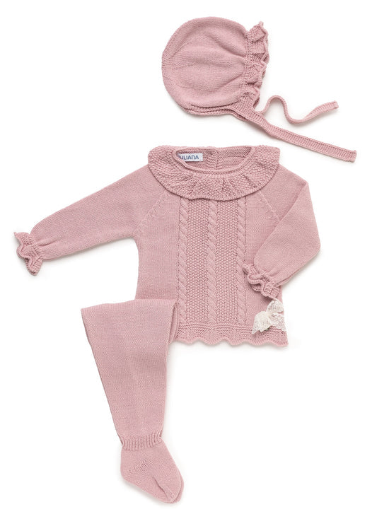 Completo Juliana neonata fondo Rosa Maquillaje, composto dalla maglia con ricami e fiocchetto laterale sul fondo, pantalone con piedino, e cuffietta, vestibilità regolare.