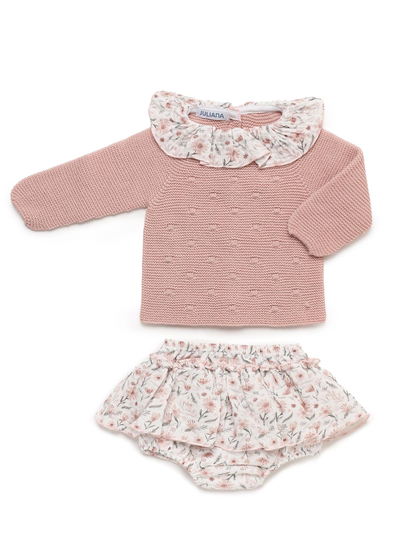Completo Juliana neonata, fondo Rosa Empolvado. Composto dalla maglia con volant al colletto in fantasia fiori, culottina che segue la stessa fantasia, vestibilità regolare.
