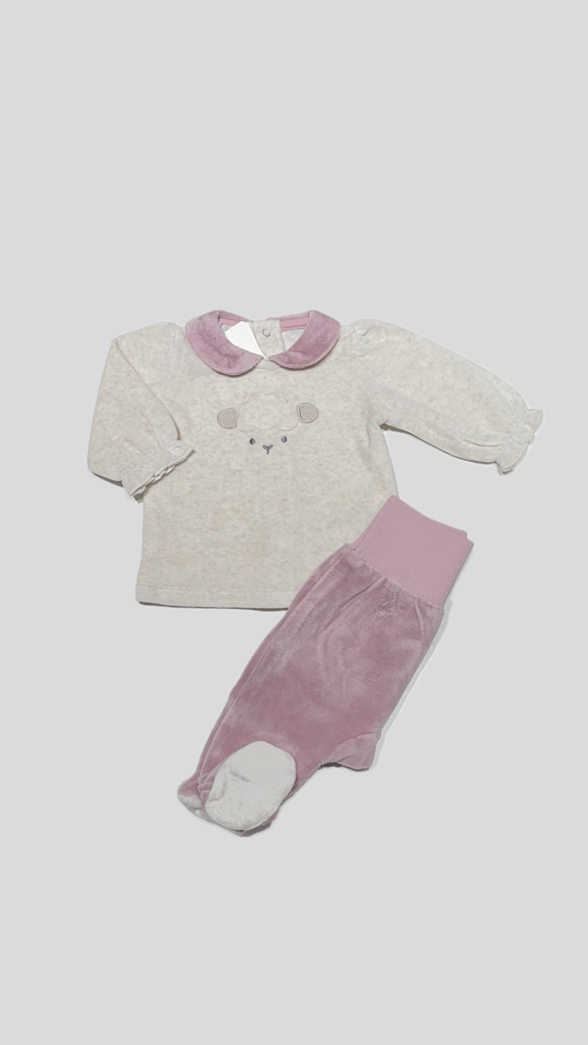 Completo Melby in ciniglia neonata, composto dalla maglia fondo Beige con profili in contrasto di colore, pantalone con piedino, vestibilità regolare.