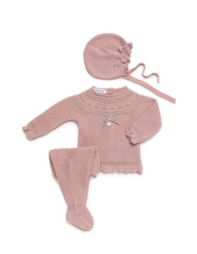 Completo in filo di cotone Juliana neonata fondo Maquillaje, composto dalla maglia con ricami in contrasto di colore, cuffietta e ghettina abbinata.