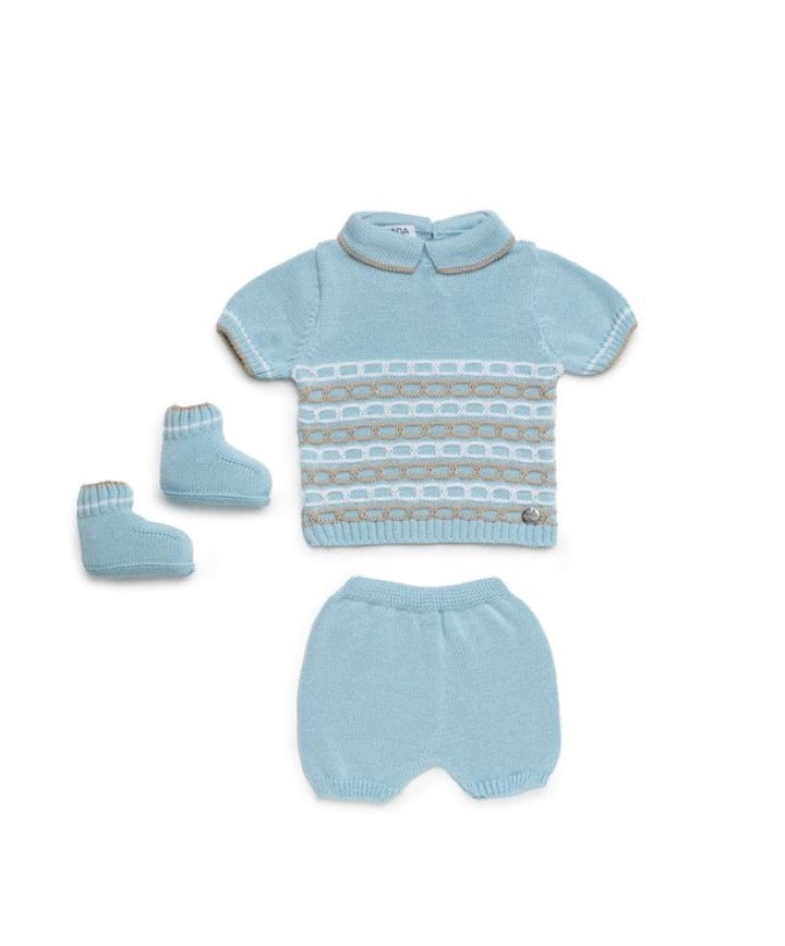 Completo Corto Juliana in filo di cotone, fondo Azzurro/Biianco/Beige. Composto dalla maglia con colletto classico, culotte e scarpine abbinate, vestibilità regolare.
