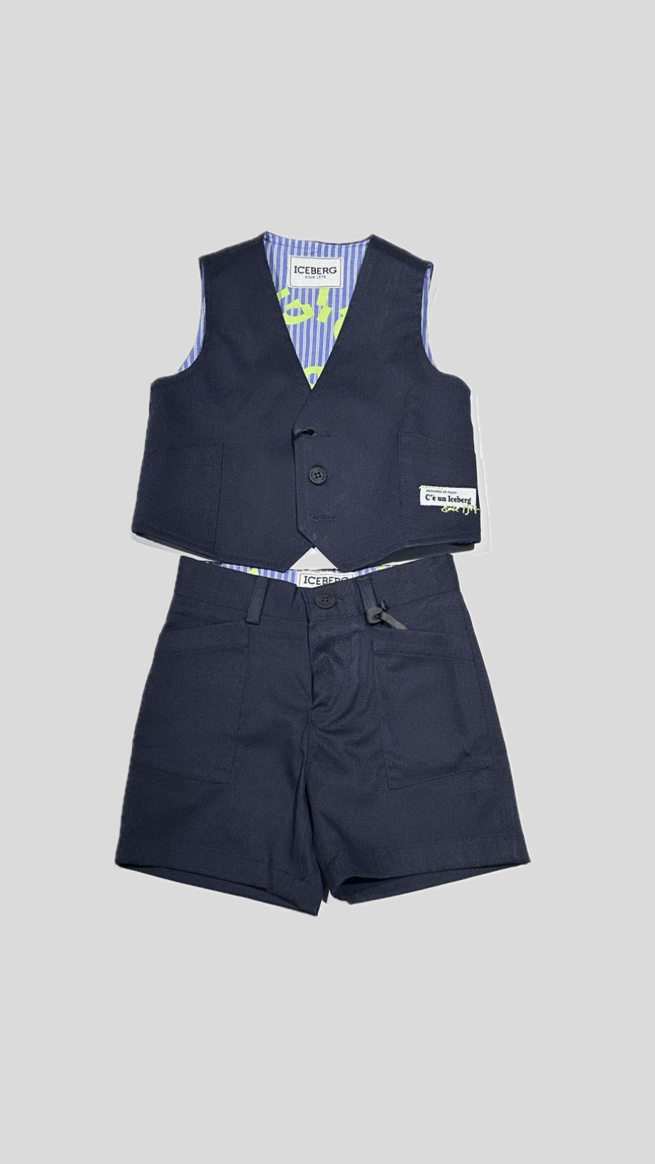 Completo classico/sportivo Paciotti, fondo Blu. Composto dal gilet, con taschini sul davanti, e logo laterale. Short Blu abbinato, vestibilità regolare.