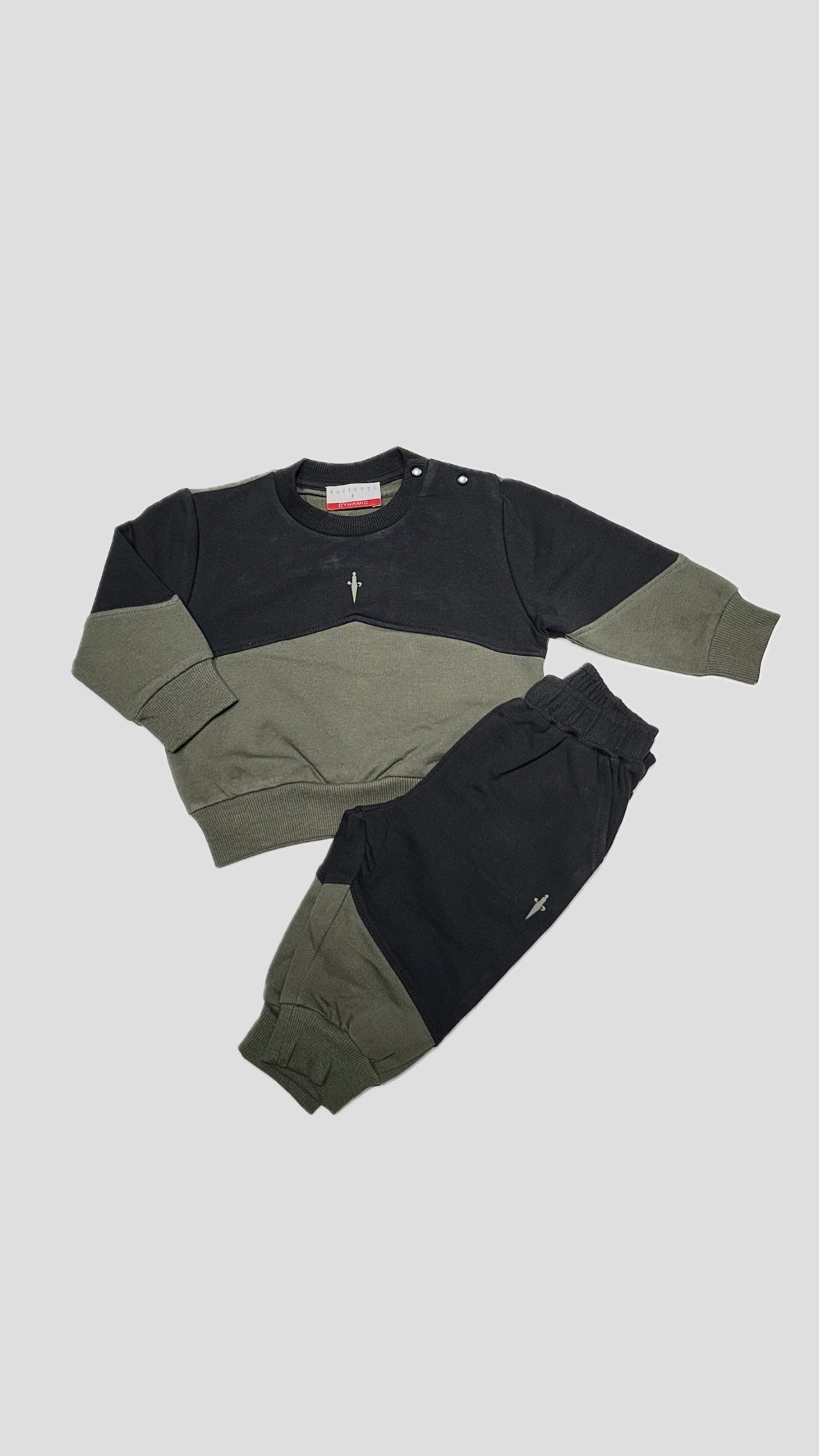 Completo di tuta Paciotti neonato/bambino, fondo Verde Militare. Composto dalla felpa con logo sul davanti centrale in contrasto di colore, pantalone di tuta con comodo elastico in vita, vestibilità regolare.