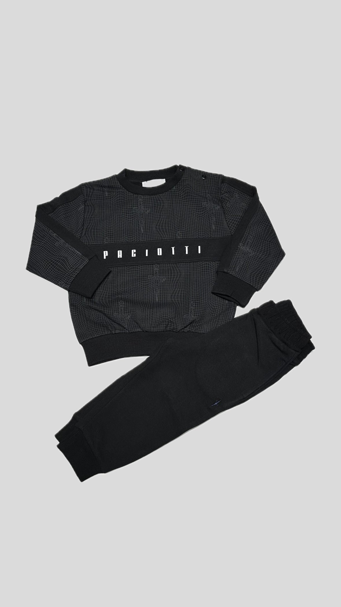 Completo Paciotti Neonato/Bambino, in cotone garzato, fondo Nero. Composto dalla felpa con logo centrale in contrasto di colore, pantalone con comodo elastico in vita, vestibilità regolare.