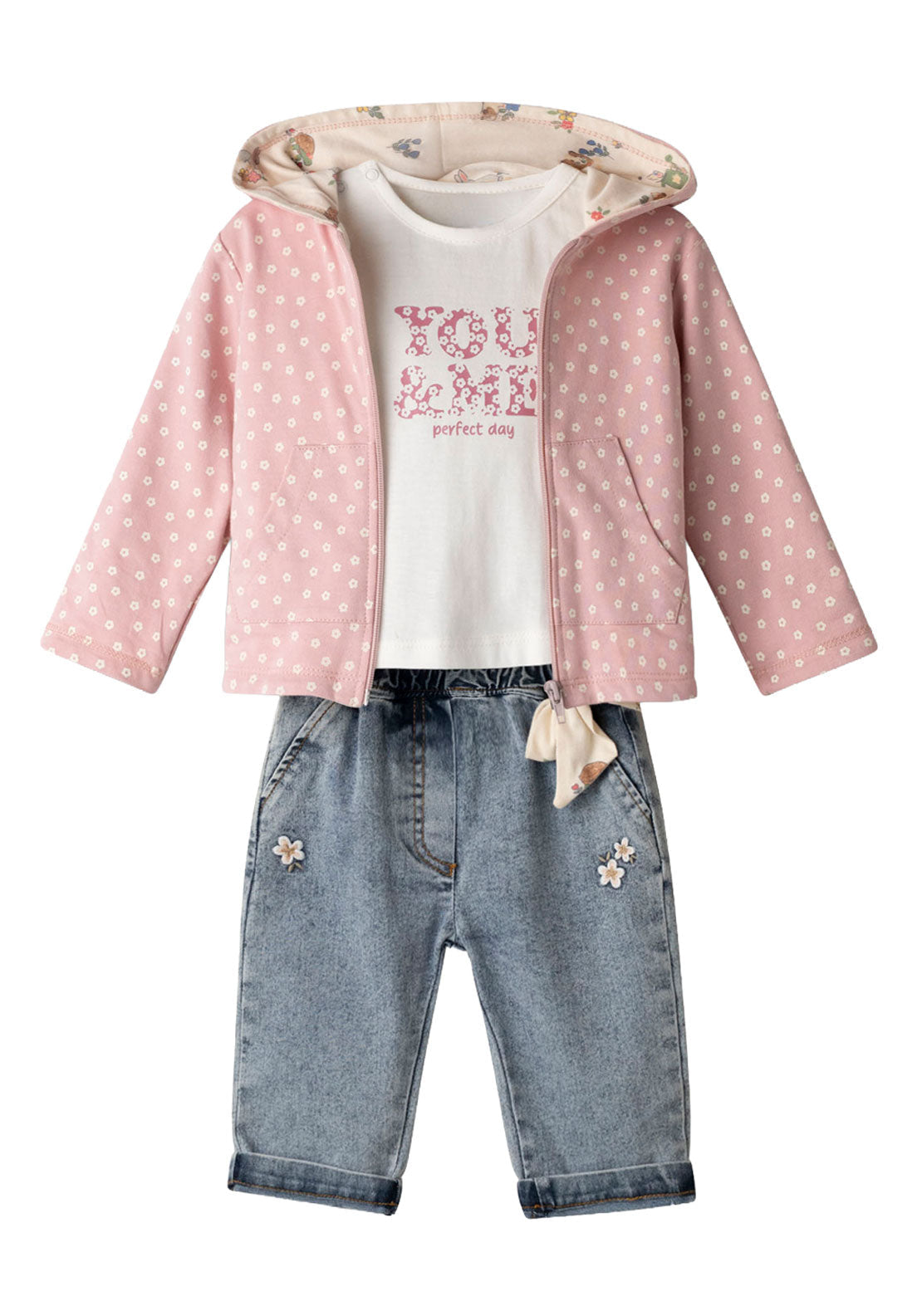 Coordinato da 3 pezzi per Neonata che combina praticità e stile estivo. Include una felpa in fantasia floreale una t-Shirt in fantasia e jeans abbinato, perfetto per le giornate calde. Realizzato con tessuti morbidi e traspiranti, ideale per giocare e esplorare con comfort. Un set versatile che cresce con la bambina, facile da coordinare con altri pezzi del guardaroba.