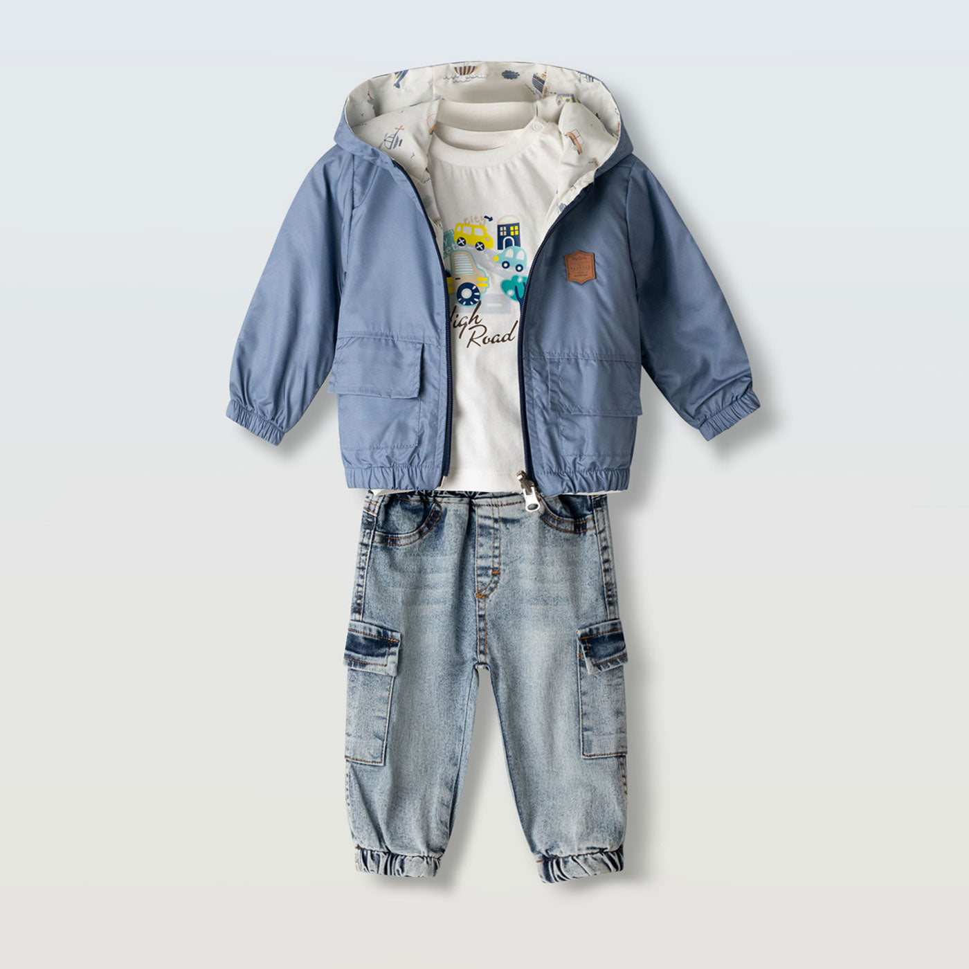 Coordinato da 3 pezzi per Neonato che combina praticità e stile estivo. Include un giubbino antivento, una t-Shirt e jeans abbinato, perfetto per le giornate calde. Realizzato con tessuti morbidi e traspiranti, ideale per giocare e esplorare con comfort. Un set versatile che cresce con la bambina, facile da coordinare con altri pezzi del guardaroba.