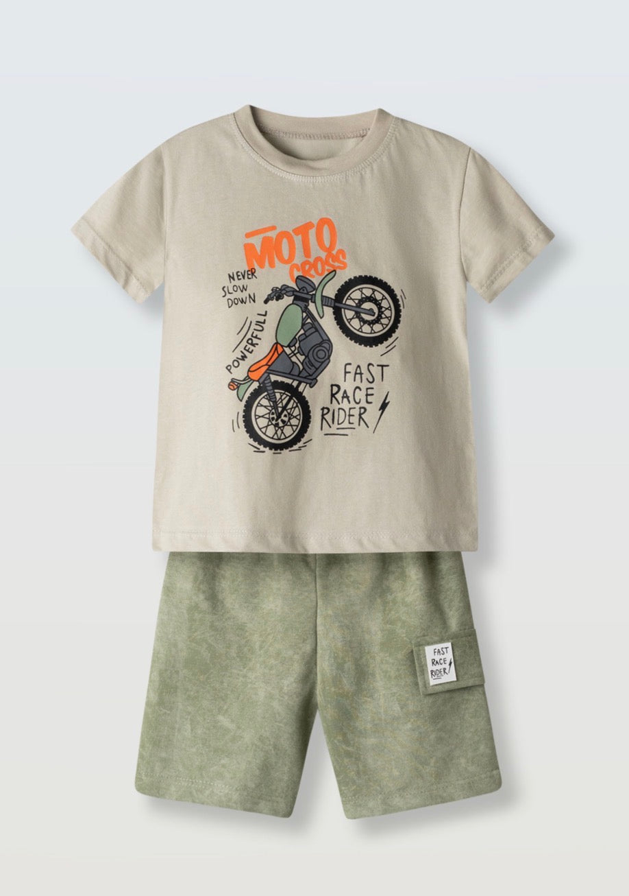 Completo Bimbo Ebita, in fantasia in contrasto di colore. Fondo grigio composto dalla t-Shirt e short abbinato fondo Verde, vestibilità regolare.